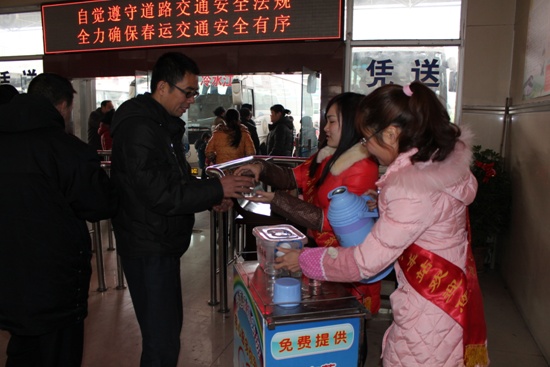 下圖為:“彩虹橋”優(yōu)質服務班付麗艷給乘車的旅客遞上一杯熱茶,希望這杯小小的熱茶能夠為旅客驅趕冬日里的寒意,添絲溫暖。